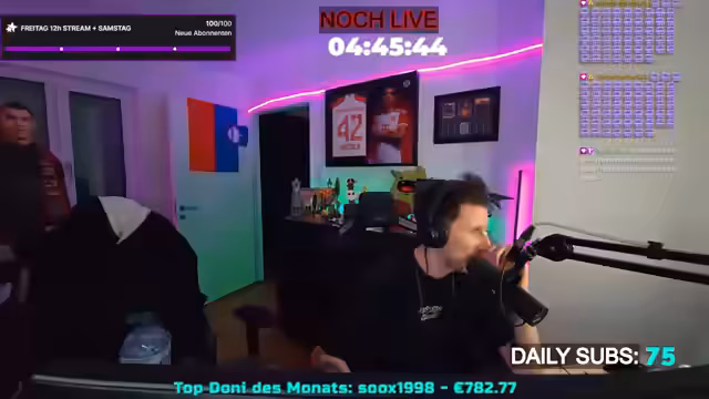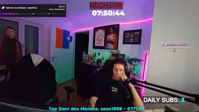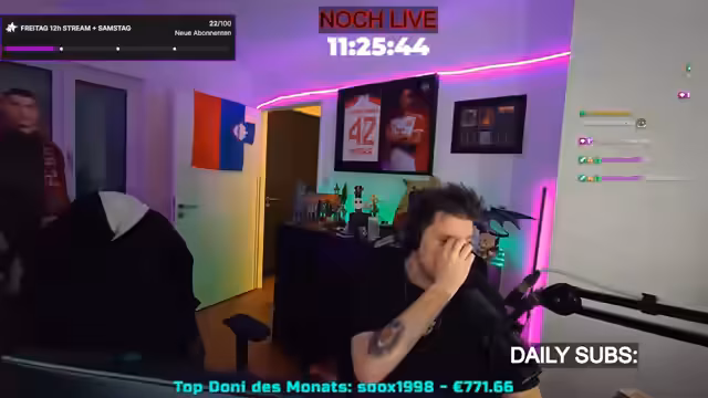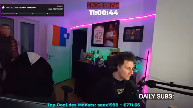 08:54:47Ein Zuschauer, der Elektriker ist, muss zur Arbeit, und der Streamer verabschiedet sich von ihm, während er die verbleibende Stream-Dauer bekannt gibt. Es stellt sich heraus, dass der Timer falsch war und der Stream noch 23 Stunden und 25 Minuten live sein wird, also den gesamten Samstag und möglicherweise sogar den Sonntag, wenn das 'Poffreit' voll wird. Der Streamer betont, dass dies das Maximum sei, da er in der nächsten Woche andere Verpflichtungen hat. Es werden persönliche Anekdoten geteilt, unter anderem über den Namen seiner Schlange 'Pyroc', der aus einem Essen stammt. Er erwähnt auch, dass er zum ersten Mal in seinem Leben einen Schurken-Charakter in einem Spiel erstellt hat. Die Diskussion kehrt zu den Schalke-Memes zurück, die als 'legendär' und 'krass' bezeichnet werden. Ein Zuschauer, Andi, wird für sein fünfjähriges Resub auf Twitch gefeiert, was als 'sehr süß' und 'herzergreifend' beschrieben wird.
