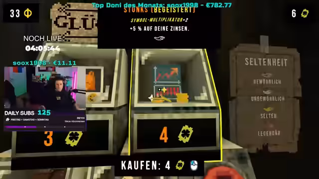 03:28:38Der Streamer konzentriert sich auf die Erhöhung des Wertes von Klee- und Glocken-Symbolen im Spiel, wobei er die Seltenheit des Siebener-Symbols hervorhebt. Er erwägt den Kauf eines Glücksbringers, der Muster mit drei oder mehr Symbolen belohnt und die aktuellen Zinsen von 24.000 erhöht, was er als 'crazy' und 'geisteskrank' beschreibt. Trotz einiger Rückschläge, bei denen er nicht alle gewünschten Symbole erhält, erzielt er weiterhin hohe Gewinne, darunter 39.000 und 44.000 Punkte. Die Möglichkeit, Glücksbringer zu verkaufen oder zu tauschen, wird in Betracht gezogen, um die Strategie zu optimieren und Platz für neue Gegenstände zu schaffen. Die Diskussion über die Spielmechaniken und die damit verbundenen Risiken bleibt ein zentrales Thema.