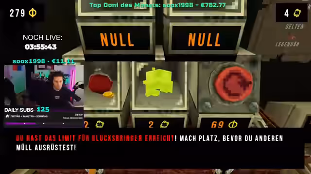 13:41:59Der Streamer versucht, Zuschauer zum Glücksspiel im Spiel zu animieren, indem er einen In-Game-Code ('Code Nilo') anbietet. Es folgen euphorische Reaktionen auf extrem hohe Gewinne im Spiel, darunter 600.000 durch 'Cherries' und ein 'Super-Jet-Pot' von 1,3 Millionen. Diese Ereignisse führen zu einer emotionalen Achterbahnfahrt, bei der der Wunsch, ins Bett zu gehen, dem Nervenkitzel des Spiels weicht. Trotz hoher Gewinne wird auch die Frustration über verlorene Runden und das Gefühl des 'Verarschtwerdens' ausgedrückt, insbesondere wenn hohe Einsätze nicht zum gewünschten Erfolg führen.