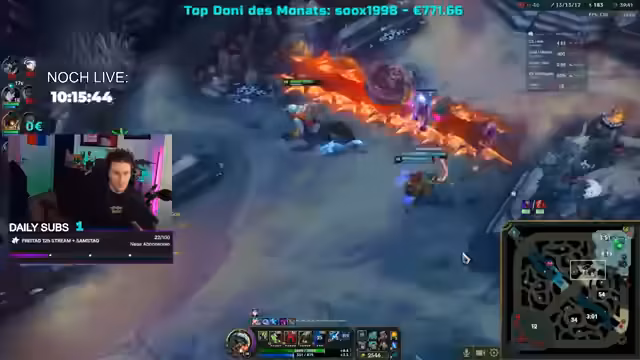 02:14:02Die Gaming-Session ist von intensiven Momenten geprägt, in denen die Spieler versuchen, strategische Vorteile zu erlangen. Ein Spieler wird mehrfach angerufen, was auf eine wichtige Angelegenheit hindeutet, während im Spiel die Teamdynamik auf die Probe gestellt wird. Es wird diskutiert, ob man den Mates folgen oder eigene Wege gehen sollte, insbesondere wenn diese sich in riskante Situationen begeben. Die Spieler erleben sowohl frustrierende als auch erfolgreiche Momente, wie das Stehlen von Kills oder das Erringen wichtiger Baron-Buffs. Trotz mancher Rückschläge und der 'Kevin-Allein-zu-Haus'-Musik im Hintergrund, die für eine ungewöhnliche Atmosphäre sorgt, bleibt die Stimmung angespannt und fokussiert auf den Sieg.