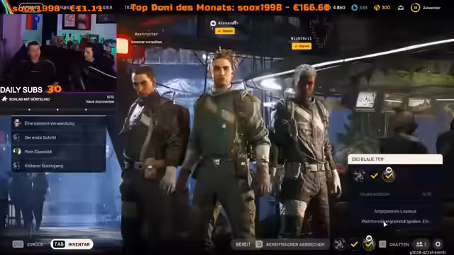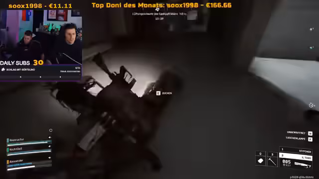 01:55:19Im Gaming-Stream spielt der Streamer mit Tuki, Alex, Michi und Nico ein Extraction-Shooter-Spiel, vermutlich ABI. Sie looten gemeinsam, kämpfen gegen andere Spieler und diskutieren Strategien. Geplant ist ein Treffen in Köln, um gemeinsam zu zocken. Es gibt Interaktionen mit Zuschauern und Shoutouts an andere Streamer wie Ruslano. Der Streamer gibt Tipps zur Spielmechanik und zum Looten.
