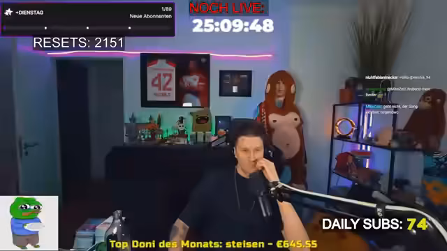 00:00:01Nach einem PC-Neustart wird der Stream wieder aufgenommen. Der Streamer ist frisch gestartet und gibt bekannt, dass der Stream bei 25 Stunden liegt und daher morgen fortgesetzt wird. Es gibt ein kurzes komisches Gefühl und die Cam ist leicht laggy, was möglicherweise an dem hochfahrenden PC liegt. Der Streamer gibt der Zuversicht, dass sich alles normalisieren wird und dankt der Community für ihre Unterstützung.