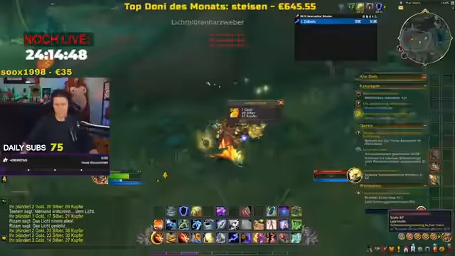 00:58:30Innerhalb des Spiels World of Warcraft wird die Frage des Levelns diskutiert. Der Streamer bevorzugt das durchspielen der Kampagne, da dies deutlich schneller ist als das Farmen von Weltquests. Bei der Nutzung von Addons wie Wombat wird kritisiert, dass es durch höhere Delays zu weniger Schaden und langsamerem Leveln führt. Die Entscheidung, darauf zu verzichten, wird als weniger faul, aber arbeitsintensiver angesehen.