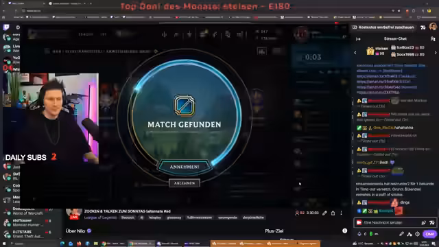 00:41:05Es wird auf ein League of Legends-Spiel eingegangen, bei dem der Streamer jungelt. Er plant, um 20 Uhr mit seiner Truppe in das angekündigte Song Battle zu starten, ist jedoch erst einmal voll im Spiel. Er berichtet über seine Position im Spiel, seine strategischen Pläne und äußert sich über seine aktuelle Stärke. Gleichzeitig wird im Chat offenbar auf eine große Summe gewettet, die für den Streamer und seine Gegner David und Fabian von erheblichem finanziellen Interesse ist und zu großer Spannung im Chat führt.
