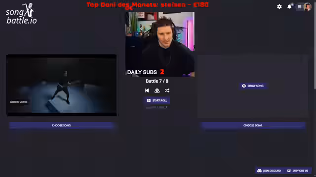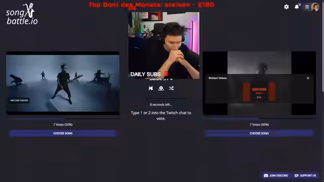 01:51:39Das Song-Battle ist nun in vollem Gang. Es werden verschiedene Songs vorgestellt, vom deutschen Rap bis zu internationalen Hits. Der Streamer kommentiert die Songs, gibt seine persönliche Meinung und beobachtet die Abstimmung im Chat. Es kommt zu teils knappen Ergebnissen und er äußert Unzufriedenheit mit der geringen Beteiligung der Zuschauer. Die Songs werden paarweise vorgestellt und das Publikum entscheidet, welcher im Turnier weiterkommt.