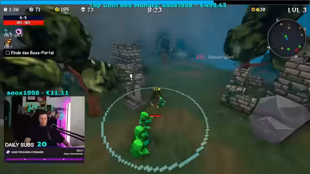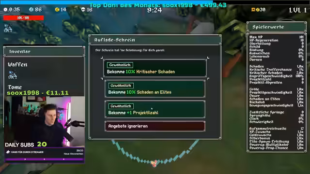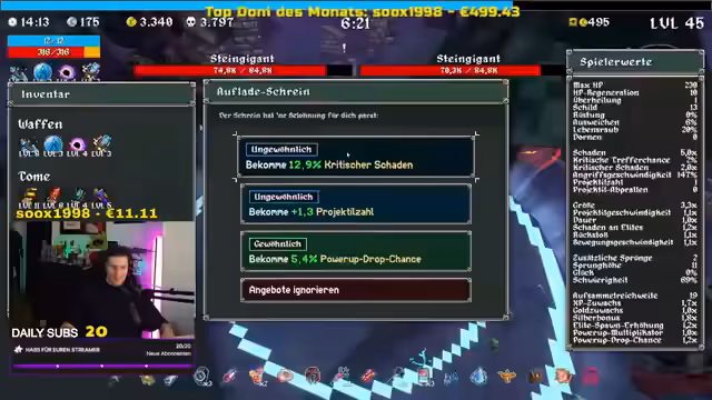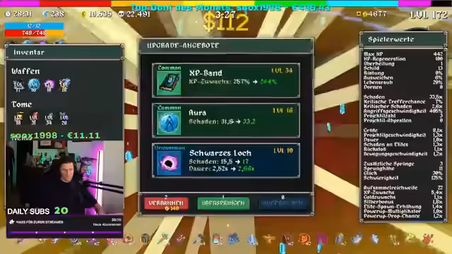 03:12:42Der Streamer bereitet sich auf einen Bosskampf in Megabong vor, einem Spiel, das er bereits seit drei Stunden spielt. Er hat noch nie zuvor einen solchen Bosskampf in diesem Spiel bestritten und ist gespannt, wie er sich schlagen wird. Er muss Totems zerstören, um den Boss zu besiegen. Während des Kampfes erreicht er einen neuen Highscore von 85.000 Punkten, was einen deutlichen persönlichen Rekord darstellt. Er ist motiviert, diesen Rekord weiter zu brechen und spekuliert über die Möglichkeiten, noch mehr Kills zu erzielen und seine Waffen auf das maximale Level 40 zu bringen. Er diskutiert die Spielmechaniken, insbesondere die Skalierung der Gegner und die Bedeutung des Sammelns von XP, um nicht ins Hintertreffen zu geraten. Trotz der Herausforderungen und der intensiven Spielweise ist er entschlossen, das Spiel zu meistern und seine Leistung zu optimieren.