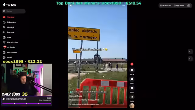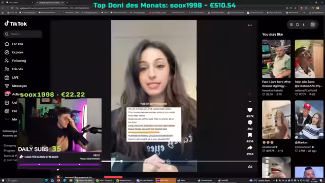 04:58:20Eine TikTok-Session wird gestartet, wobei der Streamer betont, dass der Account während des Streams erstellt wurde und er privat nichts damit zu tun hat. Es werden verschiedene skurrile Videos gezeigt, darunter ein Clip über Haribo Sour Candy, ein Clip über Euromünzen und ein Video mit dem Titel 'Weihnachten in Afghanistan, das Brettspiel'. Ein weiteres Video thematisiert das Verschwinden von Socken in der Waschmaschine. Ein Waschmaschinenfachmann erklärt, dass Socken durch einen Schlitz zwischen Trommel und Bottich gelangen und sich am Heizstab verfangen oder sogar aufgelöst werden können. Die Session endet mit weiteren humorvollen und teils absurden TikToks, darunter ein kurioses Haribo-Produkt namens 'Schniedelschleimkäse und Eichelmilch' und ein Video über die Weisheit von Frauen, die immer Recht haben.