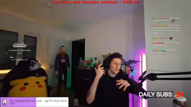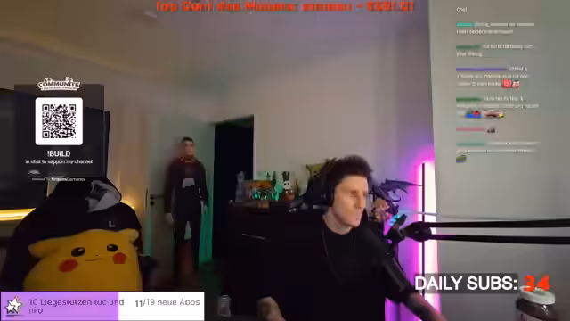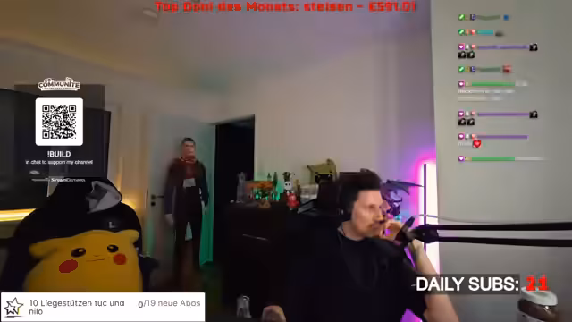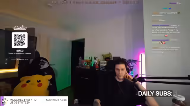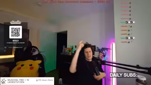04:15:42Der Streamer plant eine körperliche Challenge als Bestrafung für das Verlieren einer kommenden WinChallenge. Dabei werden Aufgaben wie 200 Liegestütze, 200 Kniebeugen und viele Minuten Planks genannt. Die Challenge soll nicht an einem Tag absolviert werden, da der Körper dies nicht verkraften würde, und als Content für einen langen Stream dienen, der während der körperlichen Aufbautage laufen würde.