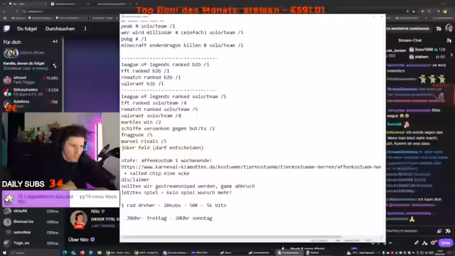 05:06:16Der Streamer plant eine anspruchsvolle Win-Challenge für Freitag um 20 Uhr. Es sind zahlreiche Spiele wie League of Legends, TFT, Valorant, Marvel Rivals und PUBG mit unterschiedlichen Win-Zielen vorgesehen. Besonders schwierige Challenges wie PUBG und Back-to-Back-Siege in Spielen wie League of Legends werden als hart eingestuft. Die Community soll sich durch Spenden und Sub-Geschenke beteiligen, um die Challenge zu unterstützen und dem Streamer zur Erfüllung der Ziele zu verhelfen.