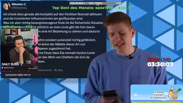 16:51:18In einer längeren Diskussion wird FanBlast kritisch beleuchtet, basierend auf Robbubbets Video mit über einer Million Aufrufen. Es geht um Vorwürfe gegen Influencer wie Knossi, der in einem 15-minütigen Stream-Statement Stellung bezog. Knossi distanzierte sich von aktuellen Praktiken der Firma, behauptete, seit zweieinhalb Jahren nicht mehr operativ involvi zu sein und von den Vorwürfen nichts gewusst zu haben. Kritisiert wird jedoch, dass er bereits früher in Werbungen mit falschen Versprechen (z.B. angebliche private Handynummern) geworben habe und sich nie davon distanziert habe. Zudem wird seine späte Reaktion trotz bekannter Skandale hinterfragt.