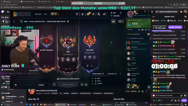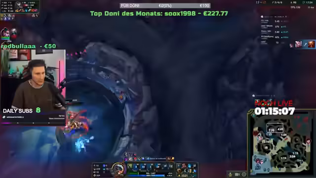 19:06:34Der Streamer spielt League of Legends und kommentiert intensiv die Runden. Er beschreibt eine Partie mit wechselhaftem Verlauf: Probleme mit unkooperativen Teammates (insbesondere im Midlane), Glück der Gegner (überlebte mit 15 HP) und erfolgreiche Gank-Versuche. Nach einem verlorenen Teamfight ("hardcore BDSM-Stacks im Dschungel") analysiert er die Schwächen seines Teams (zu langsames Rotieren, mangelnde Kommunikation). Lob für einen gegnerischen Rengar (gute Reaktionszeit, Side-Steps) mischt sich mit Frust über eigene Fehler. Parallele Interaktion mit dem Chat über "Why are you running?"-Meme und Voicechat-Scherze.