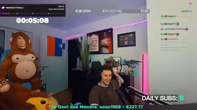 00:04:2800:04:28 Ja, ich würde schon gerne wirklich mal rein, ich sag dir, das ist, was ist auch so eine frustrierende Sache. Ich sehe so andere, also einfach nur als Beispiel, das ist nicht, weil ich mich gut drehen will, ich meine das wirklich ernst so. Ich sehe beispielsweise andere Streamer, die jetzt sogar so an ihre Mods Geschenke verteilen und die beschenken und ich würde das gerne auch machen. Nicht, weil ich, nee, nicht, weil ich irgendwie was schuldig bin, sondern einfach gerne, ich würde gerne so sagen, hey Leute, an meine Mods, wir machen euch einen Wunschzettel auf, so, ich habe was rein, was euch wünschen würde, so, was in so einem Rahmen liegen würde. Dann kann man da ein bisschen Geld mal ausgehen, weil ihr tut die ganze, das ganze Jahr wirklich hier,