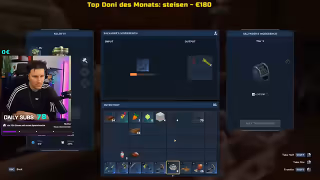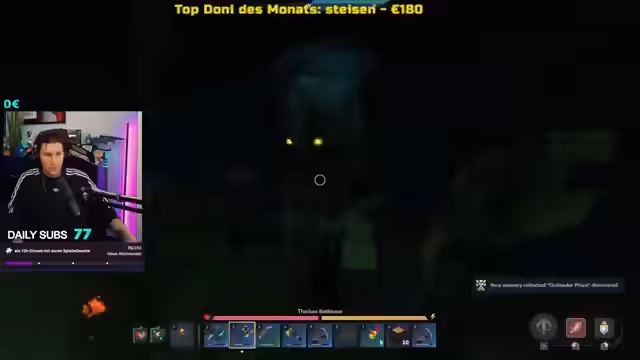 05:39:36Am Ende des Streams wird die letzte große Materialrunde abgewickelt. Der Streamer gelangt zurück zur Basis und muss seinen überschüssigen Loot in eine Kiste verfrachten, da diese jedoch zu klein ist, wird ein Teil der Ressourcen einfach auf dem Feld gelassen. Er zieht sich einen neuen Brustpanzer an und findet letztlich das geflüsterte Wort, das er die ganze Zeit gesucht hatte. Dies markiert den Abschluss der intensiven Spielsession und eine Art Erleichterung, bevor der Stream endet.