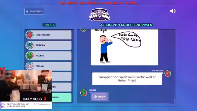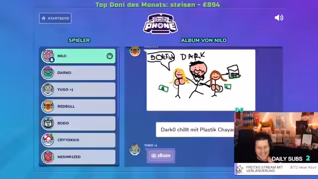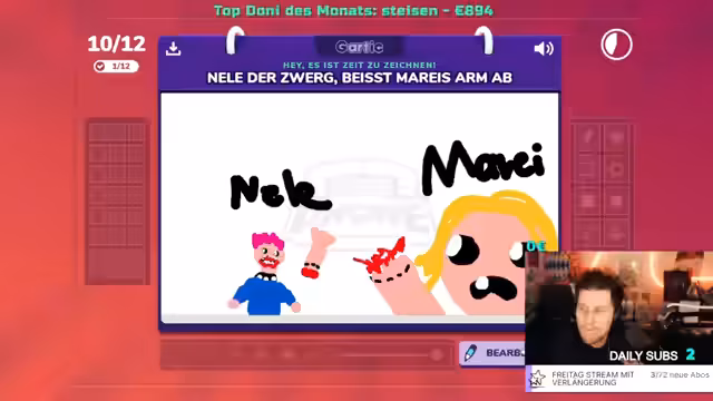 04:01:45Der Streamer äußert seine Neugierde auf die Reaktionen auf seine Zeichnungen und betont, dass er sich Mühe gegeben hat. Er erwähnt, dass Crytex noch nichts von seinem 'Glück' weiß und dass Crytex als Erster 'Sex' bekommen hat. Es wird scherzhaft angedeutet, dass Crytex einen auf den Sack bekommt, wenn er nicht mitspielt. Der Streamer beschreibt ein schwindeliges Gefühl aufgrund des Konsums einer ganzen Packung Schokokrossis und äußert Bedenken, dass Dacos Hochkonzept nicht fertig wird. Er gesteht, etwas vergessen zu haben und beeilt sich, dies zu korrigieren, um Punkte zu sammeln. Der Chat wird als misshandelnd gegenüber Nilo bezeichnet, was jedoch nicht durchkommt. Der Streamer erwähnt, dass er einen 1,6 Supporter und einen 2,5 Jungler hat und ist gespannt auf seine eigene Zeichnung. Es wird über Darkos Spinne und Mr. Spielt mit Zigarre gesprochen, sowie über die Darstellung von Nilos Verletzungen und Tod in den Zeichnungen. Der Streamer kommentiert die drastischen Darstellungen und stellt fest, dass einige der Ideen nicht so umgesetzt wurden, wie er es erwartet hatte.