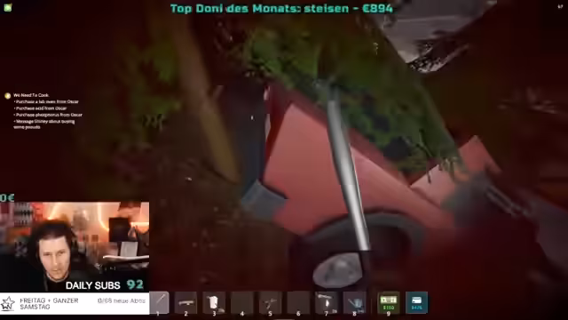 05:24:49Der Streamer plant den Aufbau eines vollständigen Drogenlabors, einschließlich einer Chemiestation und des Erwerbs von Chemikalien wie Säure und Phosphor, um später Koks und Speed herzustellen. Gleichzeitig wird über die Anpflanzung von Weed gesprochen und der Wunsch geäußert, Mixing-Streams für Gras in der Küche zu veranstalten. Es fehlen noch 2000 Dollar für den Kauf eines neuen Autos, was der Streamer durch ein 'All in' im Casino zu beschreiben versucht.