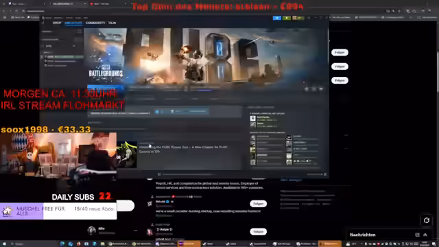 04:27:13Nach dem Kauf von Kisten im Spiel wird eine Gaming-Session für PUBG geplant. Der Streamer fragt im Chat nach Spielern, möchte aber keinen Platz wegnehmen, was zu einer Diskussion über Spielstärken führt. Es werden weitere Spieler wie Crytex und Sebu erwähnt und auf ihre Verfügbarkeit geprüft. Die Aufregung steigt, als die erste Kiste geöffnet wird und ein Gold-Skin sowie Battlestats zutage treten.