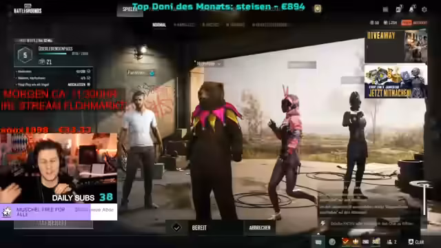 04:27:13Es wird angekündigt, dass PUBG gespielt wird und noch Mitspieler gesucht werden. Es wird überlegt, wer mitspielen könnte, aber niemandem der Platz weggenommen werden soll. Es wird festgestellt, dass Crytek jetzt Zeit hat und Sebu gefragt, ob er mitspielen möchte. Es wird über Hogwarts Legacy gesprochen, das erst zu Ende gespielt werden sollte. Es wird über Gutscheine im Docking Shop gesprochen. Es wird gefragt, was es im Shop gibt und festgestellt, dass man Keystacks oder Coupons kaufen kann. Es werden Kisten geöffnet und Skins erhalten. Es wird überlegt, ob die Skins übertragen werden sollen. Es wird über die erhaltenen Skins gesprochen und wie man sie im Spiel präsentiert. Es wird über die Wichtigkeit des Wirts gesprochen und gefragt, ob man einen Porsche bekommt, wenn man der Gruppe beitritt. Es wird vermutet, dass jemand etwas zu essen holt oder gelogen hat. Es wird über Schwarzmarkt-Tickets gesprochen und wie man sie einsetzt. Es werden verschiedene Aktionen im Spiel durchgeführt und Belohnungen angenommen. Es wird überlegt, welche Skins man herstellen und zerlegen soll, um Credits zu sammeln.