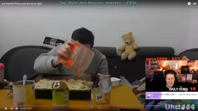 01:52:00Es wird die Zubereitung einer Pizza in einem Video kommentiert. Es wird festgestellt, dass man selbst noch nie eine Pizza gemacht hat und sich fragt, ob andere Zuschauer dies öfter tun. Es wird der Wunsch geäußert, selbst einmal eine Pizza zu machen. Der Teddy im Hintergrund wird beachtet und als wichtig erachtet. Es wird überlegt, was auf die Pizza kommen soll, wobei Tomatensoße, Brokkoli, Käse, Zwiebeln und Mais genannt werden. Zuschauer schlagen Salami, Schinken, Knoblauch und Zaziki vor. Es wird die Zubereitung der Pizza im Video kommentiert, wobei die flächendeckende Verteilung der Zutaten gelobt wird. Es wird die Frage aufgeworfen, ob Tzatziki auf Pizza üblich ist und die eigene Präferenz für Tomatensoße als Grundlage geäußert.