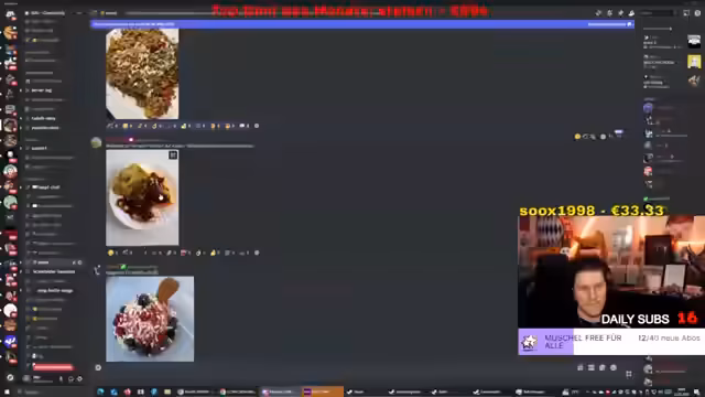 02:16:22Der Fokus wechselt zu verschiedenen Mahlzeiten, die Zuschauer im Chat posten. Der Streamer bewertet die Gerichte, wobei seine Vorlieben und Abneigungen deutlich werden. Er lobt Gerichte wie Erdnuss-Kokoscreme auf Reis und Burger mit karamellisiertem Brot, lehnt aber scharf Grießpudding und Milchreis ab. Auch Zucchini und Aubergine sind bei ihm aufgrund einer Allergie tabu. Er betont, dass es bei Essen vor allem auf Geschmack ankomme und optische Dekoration zweitrangig sei.