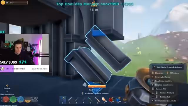 09:36:04Der Streamer beschäftigt sich mit dem Bau von komplexen Strukturen, wobei er auf technische Probleme stößt, die das Bauen behindern. So erwähnt er, dass die Platten nicht stimmen und Ketten beim Bau stören. Zudem baut er weiter an seinem Basisbau, freischaltete neue Pakete und baute Gerüste, während er gleichzeitig über die Schwierigkeiten spricht, sich in der Umgebung zurechtzufinden. Die Bauvorhaben sind anspruchsvoll und er muss immer wieder Anpassungen vornehmen, die das Projekt in die Länge ziehen.