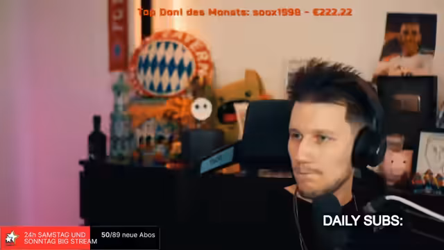 09:45:05Auf dem Höhepunkt des Streams reflektiert der Streamer über seine persönliche Situation und den Lebensstil, den der Streaming-Job mit sich bringt. Er gibt an, in Düsseldorf sehr einsam zu sein und fast ausschließlich über seinen Stream soziale Kontakte zu pflegen. Er beschreibt, wie die streamingintensive Lebensweise oft zu Vernachlässigung der eigenen Gesundheit und Psyche führt. Gleichzeitig ist er sich der Tatsache bewusst, dass er seinen Traum lebt, und gibt dem Chat Ratschläge für einen gesunden Ausgleich, wie ausreichend Schlaf, Zeit in der Natur und soziale Kontakte, um einen gesunden Lebensrhythmus zu finden.