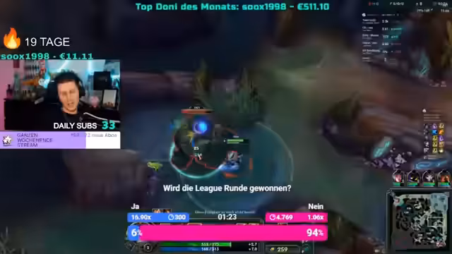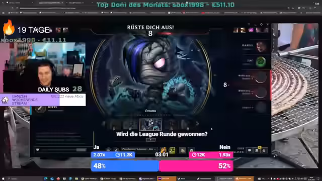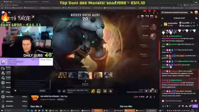 01:18:10Der Streamer spielt mehrere Runden des Spiels League of Legends und kommentiert das Gameplay laufend. Er beschreibt seine Positionen, die Taktiken der Gegner und seine Entscheidungen im Team. Gleichzeitig interagiert er intensiv mit dem Chat, beantwortet Fragen und greicht auf Kommentare und Aktionen der Zuschauer ein. Er berichtet über seine Erfahrungen in den Runden, die sowohl gewonnene als auch verlorene Spiele umfassen, und erwähnt seinen aktuellen Rang in den verschiedenen Spielmodi.