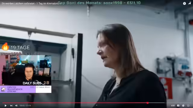 00:29:41Der Streamer zeigt einen Besuch in einem modernen Krematorium in Deutschland. Es wird der Ablauf von der Ankunft des Sarges über die Kühlung, die zweifache Leichenschau bis hin zur Einäscherung erklärt. Dabei werden technische Details wie die Temperatur von bis zu 800 Grad und die Dauer des Prozesses erwähnt. Auch die Sorge vor dem Vertauschen der Aschen wird thematisiert, indem die digitale Nachverfolgung erklärt wird.