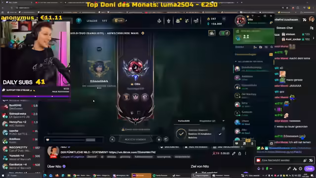 03:58:59Nach dem League of Legends-Match wird wieder mit der Community interagiert. Ein Stream-Viewer namens 'Taktik' scheint für sein Engagement mit Subs belohnt werden zu wollen. Der Streamer kommuniziert direkt mit ihm und bietet ihm an, in einer neuen Runde zu spielen. Es werden die Bedingungen geklärt, unter denen Taktik mitmachen darf, und die Situation wird mit Humor und interaktiven Elementen gestaltet.