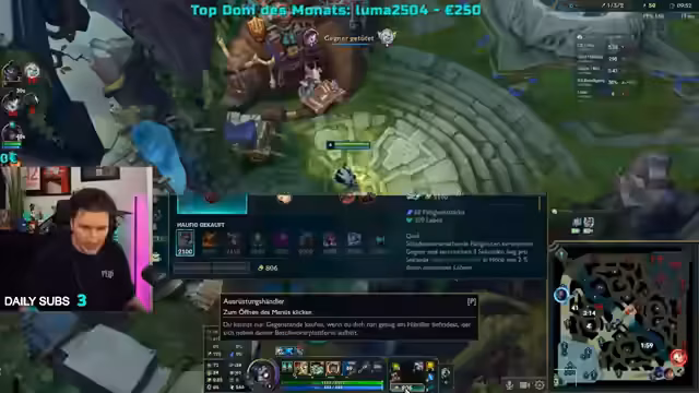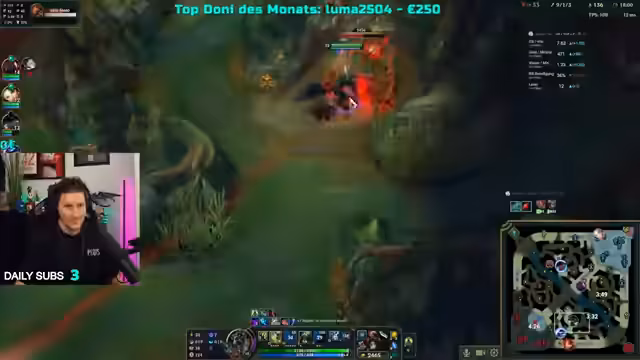 02:52:15Der Streamer wechselt zum Thema Gaming, speziell League of Legends, und analysiert ein kürzlich gespieltes Match. Er beschreibt, wie seine Mid-Lane durch einen aggressiven Gegner früh ins Hintertreffen geriet und er als Jungle kaum helfen konnte, da der Gegner bereits nach fünf Minuten deutlich überlegen war. Er kritisiert die fehlende Teamkoordination und strategische Planung seines Teams, die letztendlich zum Verlust des Spieles führte. Der Fokus lag auf den eigenen Farm-Problemen und der mangelnden Objekt-Kontrolle.