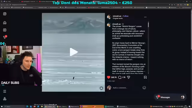 00:29:05Ein neues Thema ist die Viralität einer Dokumentation über einen Pinguin aus dem Jahr 2007, die in 2026 plötzlich wieder an Aufmerksamkeit gewinnt. Der Streamer beschreibt das fiktive Szenario eines Pinguins, der aus seiner Kolonie ausbricht und in den Tod läuft, weil er seinem Instinkt folgt. Dies symbolisiert für ihn den Mut, den eigenen Weg zu gehen, auch wenn er scheinbar irrational oder zum Scheitern verurteilt ist. Die Geschichte, die mit einem modernen Orgel-Beat unterlegt wurde, wird als tiefgründig und inspirierend beschrieben und hat den Streamer stark motiviert.
