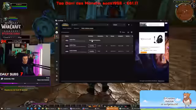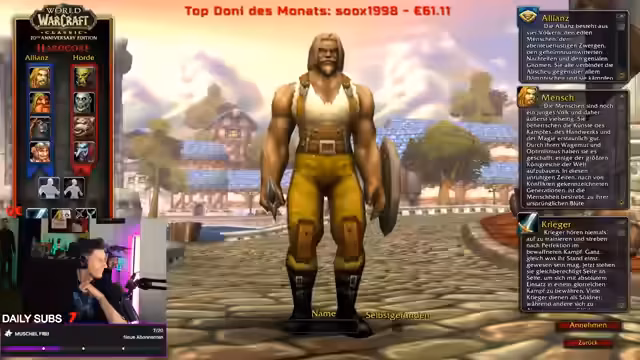 03:23:30Die Spieler bereiten sich auf den Start von WoW Hardcore vor, wobei sie den richtigen Server auswählen müssen, da es PvP- und PvE-Server gibt. Sie entscheiden sich für den PvE-Server 'Soulseeker Hardcore'. Es wird über die Charaktererstellung gesprochen, insbesondere über die Namenswahl und die Tatsache, dass das Aussehen des Charakters nach der Erstellung nicht mehr geändert werden kann. Der Streamer möchte sich 'Schogetten' nennen, was auf Ablehnung stößt. Sie starten das Spiel und müssen Addons wie 'Rested XP' herunterladen und installieren, um den Leveling-Guide zu nutzen. Es kommt zu technischen Schwierigkeiten beim Installieren der Addons. Die Spieler müssen Quests annehmen und dem Pfeil des Guides folgen. Es wird festgestellt, dass ein Spieler einen Krieger spielt, während die anderen Jäger sind. Beim Kampf gegen Gegner kommt es zu Problemen, da die Gegner 'getaggt' werden und somit nicht von allen Spielern gelootet werden können. Ein Spieler stirbt im Kampf gegen einen Level-3-Mob, was zu Frustration führt, da er seine Volksfähigkeit nicht genutzt hat.