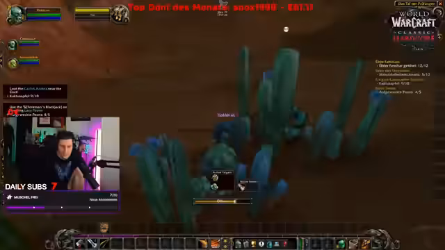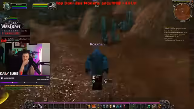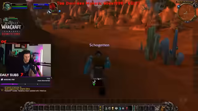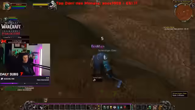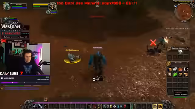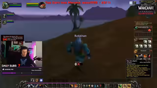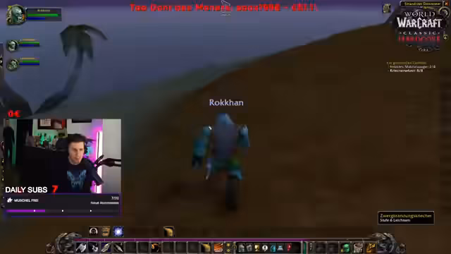 03:35:51Nach dem ersten Charaktertod in WoW Hardcore wird der Spieler aufgefordert, einen Todes-Counter einzubauen. Der Streamer wird in eine Gruppe eingeladen und es kommt zu einem Duell auf Leben und Tod, das jedoch abgebrochen wird. Der Spieler ist frustriert über seinen frühen Tod und die Tatsache, dass er seine Volksfähigkeit nicht genutzt hat. Es wird beschlossen, einen neuen Charakter zu erstellen, diesmal als Jäger, um den gleichen Guide wie die anderen zu nutzen. Der Streamer wird erneut getötet, diesmal in einem Duell gegen einen anderen Spieler. Er kehrt als 'neuer Ork' zurück und die Gruppe setzt ihre Reise fort. Es kommt zu weiteren Duellen und Neckereien zwischen den Spielern. Die Gruppe muss 'grinden', um genügend Erfahrungspunkte für die nächsten Quests zu sammeln. Es wird betont, dass man auch alleine weiterleveln kann, wenn man möchte.
