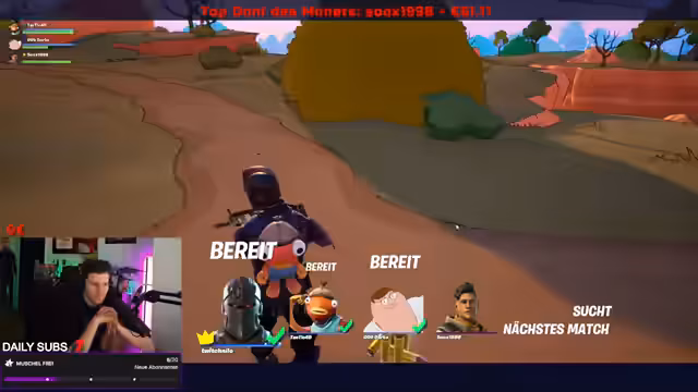 02:44:56Nach einem unerwartet einfachen Sieg, der als 'Bot-Lobby' interpretiert wird, feiern die Spieler ihren ersten Win in Fortnite. Pascal wird aufgefordert, 'Ready' zu drücken, um die nächste Runde zu starten. Es wird spekuliert, ob Pascal für seinen ersten Sieg in dieser Season einen Regenschirm erhalten wird, wie es früher üblich war. Die Spieler diskutieren ihre Kill-Zahlen, die zwischen 6 und über 20 Kills liegen. Trotz des Sieges gibt es eine kurze Unterbrechung, da ein Spieler versehentlich 'Abbrechen' drückt. Die Gruppe bereitet sich auf die nächste Runde vor, wobei ein Spieler bereits aus dem Flugzeug springt. Das Ziel ist 'Camp Krusty', ein Ort, den der Streamer schon immer besuchen wollte, obwohl er als 'abgeranzt' beschrieben wird. Es wird vermutet, dass 'Camp Krusty' ein 'Capture the Flag Spot' ist, wo das Einnehmen alle Kisten und Gegenstände sichtbar macht.
