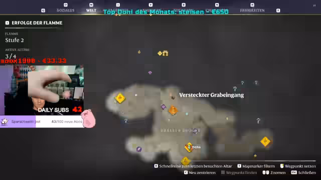 06:57:23Der Streamer analysiert die aktuelle Quest 'Plünderer-Versteck', bei der es sich um die Beschaffung eines legendären Schwertes handelt. Er identifiziert den Ort auf der Karte und plant, mit den Spielern Darko und Taktik die Höhle aufzusuchen. Zunächst soll ein ausreichend großer Raum in den Berg gehauen werden, bevor ein Altar für einen Flammen-Spawnpunkt platziert wird. Der Fokus liegt auf der effizienten Bewältigung dieser Mission und der Vorbereitung des Standorts.