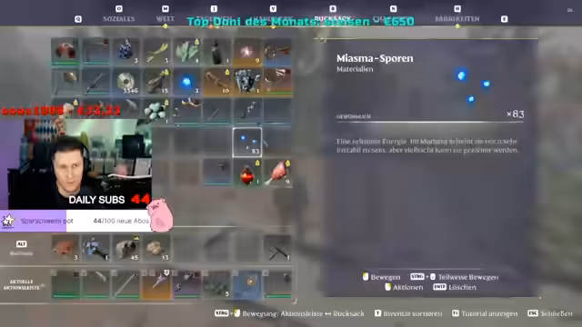 08:39:52Es wird überlegt, die Basis durch den Berg hindurch zu erweitern. Ein Spieler schlägt vor, mit einem anderen Charakter, der höherstufig ist, den Altar zu upgraden, um zu sehen, wie weit man bohren kann. Es wird diskutiert, ob das Nutzen eines anderen Charakters zum Upgraden als Cheaten angesehen werden könnte, aber entschieden, dass es in Ordnung ist, da es nur die Basis betrifft. Die Gruppe überlegt, wie man an Miasma-Seelen kommt, die für Upgrades benötigt werden. Es wird erklärt, dass man Miasma-Sporen benötigt, um Seelen herzustellen, und dass diese beim Alchemisten hergestellt werden können. Ein Spieler zeigt seine Waffen und Tränke von einem höherstufigen Charakter. Es wird eine Technik zum schnellen Abbauen von Miasma-Flüssigkeit gezeigt. Der Streamer erzählt von einem früheren Erlebnis, als er mit einem niedrigeren Level einen Endgegner besiegt hat. Es wird festgestellt, dass ein Spieler auf Platz 1 einer Rankingliste steht.