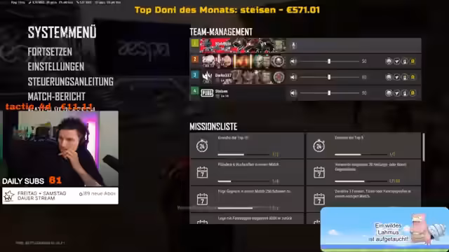 03:29:04Nach dem League-Spiel wechselt der Streamer zu PUBG. Es gibt technische Anpassungen bei der Lautstärke im Teamspeak, bei denen der Streamer seine Lautstärke anpasst und den Moderator bittet, seine eigene Lautstärke zu erhöhen. Der Streamer erwähnt PUBG-Pläne und den Wunsch, einen Winner Winner Chicken Dinner zu machen.
