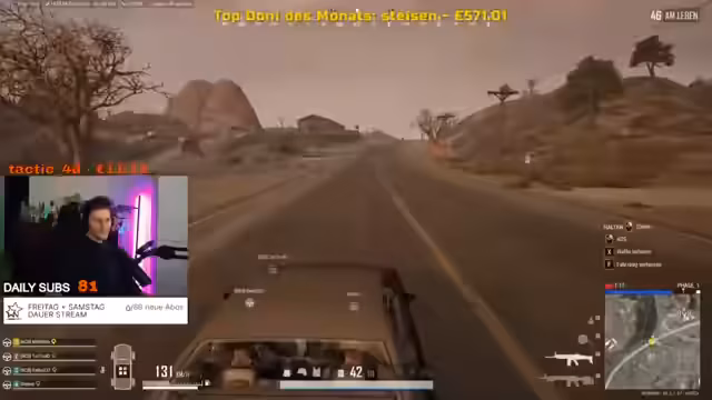 04:26:47Nach der filmischen Unterführung kehrt der Fokus zurück zum laufenden Spiel. Der Streamer beschreibt eine hektische Verfolgungsjagd in einem Auto, bei der er und sein Teammitglied von einem Gegner beschossen werden. Die Handlung ist schnelllebig und voller Action, bei der die Spieler versuchen, ihren Verfolgern zu entkommen oder diese auszuschalten.
