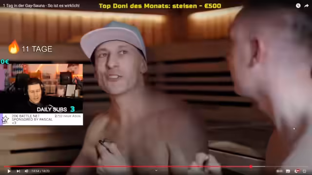 00:57:51Nachdem die technischen Voraussetzungen für Filmaufnahmen entfallen sind, berichtet der Streamer von seinem Besuch in einer Gay-Sauna. Er beschreibt die Atmosphäre als offen und fokussiert auf sexuelle Begegnungen, im Gegensatz zu einer klassischen Wellness-Sauna. Er beobachtet diverse Aktivitäten, wie das Zusammensein im Whirlpool, im Darkroom und an Glory Holes, und erwähnt ein komisches Gefühl, das bei ihm durch aufdringliche Blicke und das Gefühl des Verfolgtwerdens entstanden ist. Zuletzt fasst er den Ort als einen 'Safe Space' für schwule Männer zusammen, der Normalität schafft, betont aber, nichts für ihn persönlich zu sein.