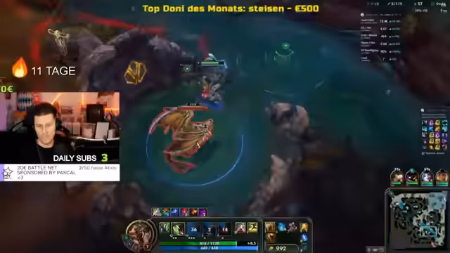 01:15:21Nach einigen organisatorischen Schwierigkeiten, bei denen nicht genug Mitspi gefunden werden, beginnt der Streamer ein League of Legends-Ranked-Spiel. Er kommentiert das Spiel live, analysiert die Champions-Wahl des gegnerischen Teams und gibt seinem Teamkollegen Clemens taktische Ratschläge. Der Verlauf des Spiels ist von anfänglichen Schwierigkeiten auf der Top-Lane geprägt, doch durch gelungenes Teamplay und dem Nutzen von Ultime kann das Spiel letztendlich erfolgreich beendet werden. Anschließend wird das Gameplay analysiert und Fehler, insbesondere beim Teilen von Kills, werden besprochen.