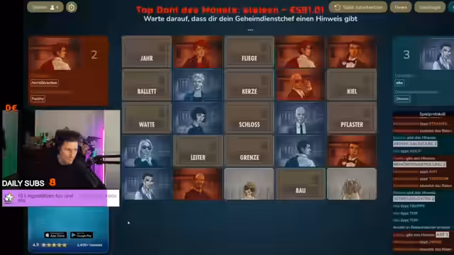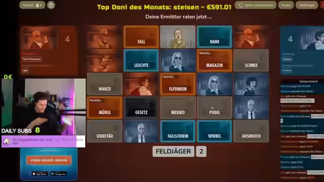 01:49:30Es beginnt eine neue Runde mit dem Wort 'Befehlsausgabe'. Der Streamer und Pascal diskutieren Begriffe wie 'Bau', 'Schiedsrichter', 'Leiter' oder 'Truppe'. Sie überlegen, ob ein 'Schiedsrichter' auch eine 'Leitende Person' ist oder ob 'Befehlsausgabe' mit einer 'Tastatur' in Verbindung gebracht werden kann. Die Rateversuche gestalten sich als knifflig, da viele der genannten Begriffe zwar passen, aber nicht eindeutig sind.