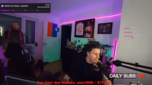 05:00:40Nach einer intensiven Gaming-Session reflektiert der Streamer den vergangenen Tag. Er äußert sich zu der Belastung, die durch den ständigen Streamen und die Abwesenheit von freien Tagen entsteht. Im Anschluss führt er die Zuschauer auf eine virtuelle Wohnungsbesichtigung, die den Streaming-Raum, das Bad und den Wohnbereich zeigt. Er betont, dass der Streaming-Raum zwar klein, aber für seine Zwecke perfekt sei und ihn nicht überfordere.