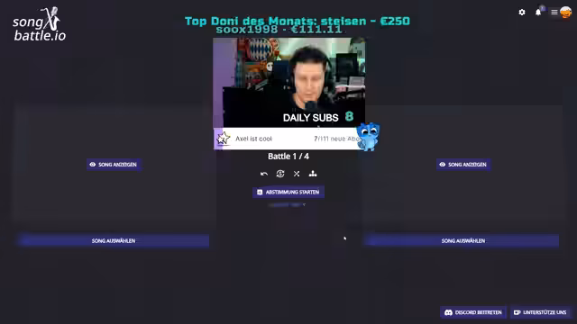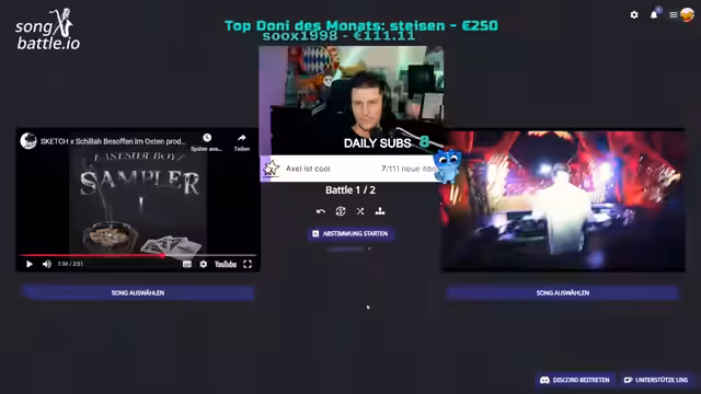 02:44:14Der Stream stellt das monatliche Song Battle-Format vor. Der Streamer erklärt den genauen Ablauf: 16 Songs treten in einem K.O.-System an. Jeder Battle besteht aus zwei Songs, die für 31 Sekunden vorgestellt werden, bevor das Publikum per Chat abstimmen kann. Es werden strikte Regeln aufgestellt: Keine Abstimmung vor dem Hören der Songs und keine Kommentare während der Abstimmungsphase, um faire Bedingungen und Respekt für alle Teilnehmer zu gewährleisten. Am Ende gibt es Preise für die Gewinner und für alle, die abstimmen.