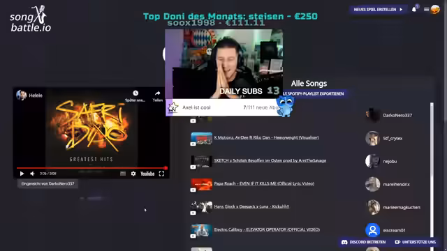 02:55:55Bei der Vorstellung des Songs 'Ren Losing It' entsteht eine Nostalgie-Diskussion. Der Streamer äußert seine Bewunderung für den Rapper Kollegah und dessen einzigartige Fähigkeit zum Double-Time-Rappen. Dies führt zu einer allgemeinen Reflexion über Rap-Musik und die Entwicklung des Genres. Der Fokus der Battles liegt auf der reinen künstlerischen Leistung, auf die das Publikum abstimmt. Ein unerwartetes Duell ist ein Papa Roach-Song gegen einen anderen Papa Roach-Song, was vom Streamer als 'unlucky' bezeichnet wird.