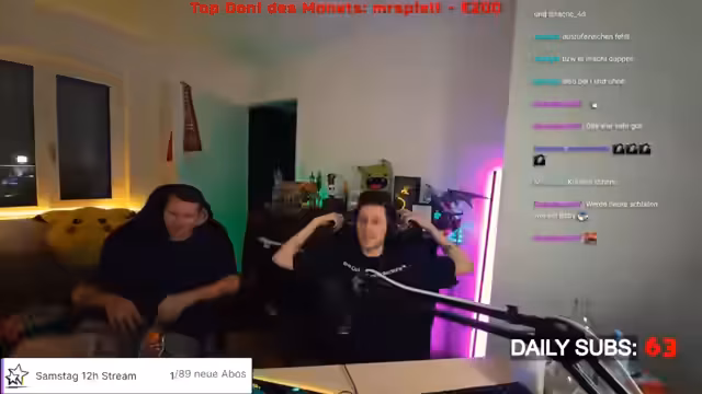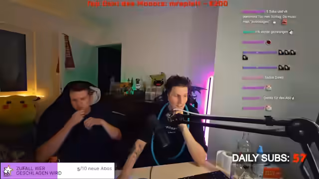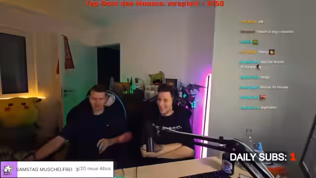 01:17:59Der Streamer interagiert intensiv mit dem Chat und führt verschiedene physische 'Schlagspiele' durch, die durch Spenden ausgelöst werden. Dabei werden Gegenstände wie Gerte und Gürtel verwendet, um auf Oberschenkel zu schlagen. Die Intensität der Schläge wird durch Spendenbeträge bestimmt, wobei der Streamer zeitweise Bedenken äußert, den Teilnehmer zu verletzen. Die Szene wird durch Kommentare und Reaktionen des Chats begleitet, der teilweise schockiert, teilweise amüsiert auf die Vorgänge reagiert.