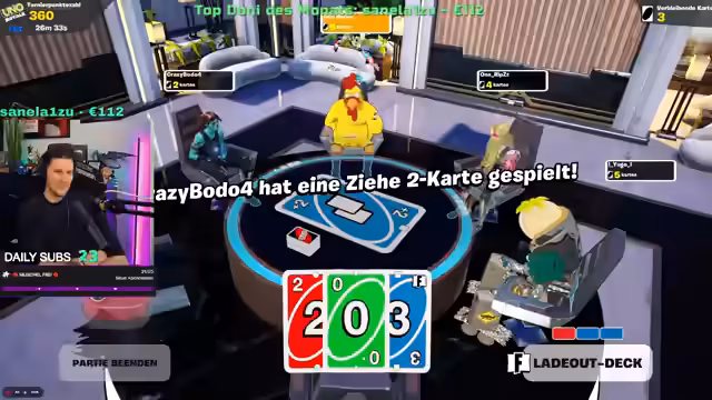 03:02:35Nach einem stressigen Auszug wechselt der Streamer zu einem anderen Spielmodus, UNO. Die Atmosphäre ist lockerer und ein privates Gespräch mit den Spielern Darko und Rippy wird geführt. Es gibt Pläne für gemeinsames Spielen in 'League of Legends' oder einem Leaks-Modus eines anderen Spiels, je nachdem, was der Chat möchte. Der Streamer wirkt müde und hat Kopfschmerzen, gibt aber seinen Willen bekannt, weiterzuspielen, und appelliert an die Follower, ihm auf Twitch zu folgen, um nichts zu verpassen.