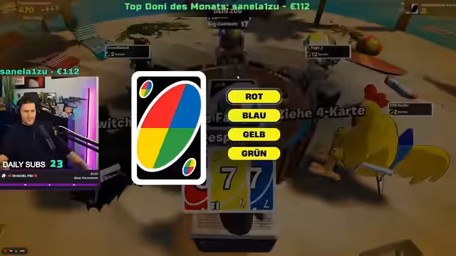 04:28:08Bei einem Spiel UNO stellt der Streamer fest, dass in der Runde fast nur Frauen aktiv Karten spielen, während die Männer überwiegend Karten ziehen müssen. Dies kommentiert er ironisch mit 'klare Männerausgrenzung' und dem skurrilen Vorschlag, Männer 'in Käfige zu halten', um nur 'zum Bumsen gebraucht' zu werden. Dies ist offensichtlich eine spielerische Übertreibung.