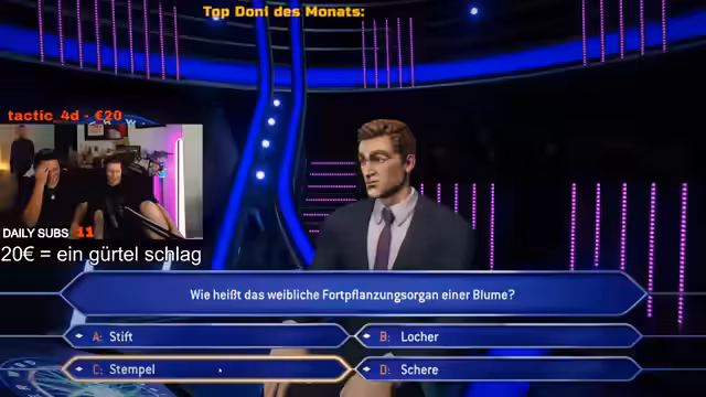 03:04:31Das Hauptereignis des Stream ist die Teilnahme an einer Online-Quizshow, bei der der Streamer um eine virtuelle Million Euro spielt. Nach einigen wissensbasierten Fragen, bei denen er einige korrekte Antworten gibt, kommt er zu einer kritischen Million-Euro-Frage. Da er die Antwort nicht weiß, entscheidet er sich für die 50-50-Option, um die falschen Antworten zu eliminieren. Die Wahl fällt auf zwei verbleibende Antwortmöglichkeiten, und die Spannung steigt, während der Streamer seine Entscheidung trifft und darauf wartet, ob er die Frage richtig beantworten wird.