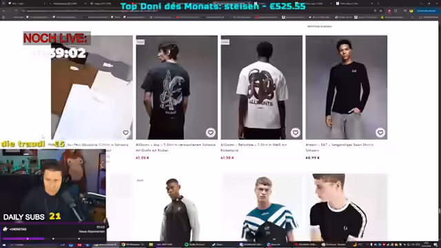 13:21:53Nachdem die Hose bei ASOS ausgewählt wurde, bleibt der Kaufstatus unklar. Streamer erklärt, dass er normalerweise bei Pikes kauft, da er dort gute Qualität und Rückgabemöglichkeiten hat, und nach längerem Zögern bestätigt er, dass er dieses Mal dort bestellen wird. Der Stream nähert sich dem Ende, und Streamer kündigt an, dass ein anstehender Shop die verlorene Spielzeit kompensieren wird. Er erwähnt zudem, dass die Streamdauer auf 120 Stunden verlängert wurde, solange die Ziele erreicht werden, und gibt den Chattern für die Unterstützung Anerkennung.