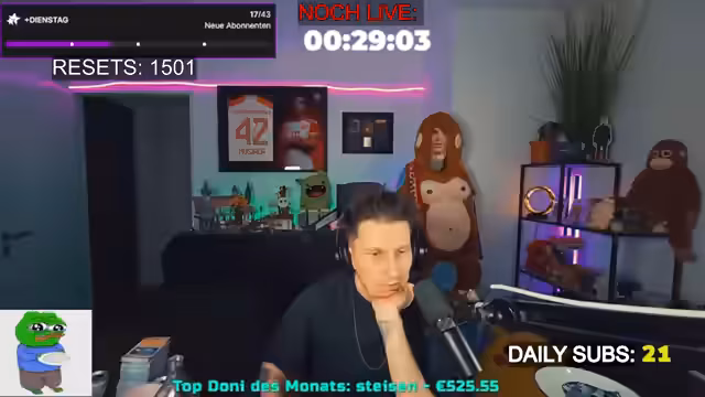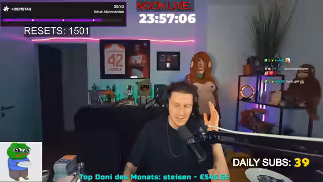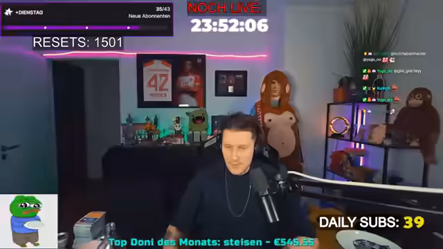 Der Marathon wurde erfolgreich fortgesetzt, wobei die Dauer nun auf 120 Stunden festgelegt wurde. Es wurden verschiedene aktuelle Themen besprochen, wie die Kritik an Influencern und die zunehmende Polarisierung im Netz. Zudem gab es persönliche Updates zur bevorstehenden Operation und eine Kooperation mit dem Chat bei einem Spiel, das Teamwork erforderte, um gemeinsame Ziele zu erreichen.