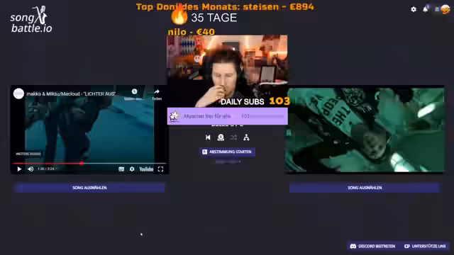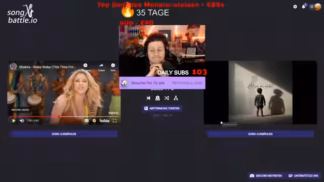 05:54:21Nach dem emotionalen Gespräch wechselt der Streamer zum Hauptereignis des Abends - dem Song Battle. Er erklärt die Regeln des Wettbewerbs, bei dem Zuschauer über Chatvoting entscheiden, welche Songs weiterkommen. Gleichzeitig kündigt er seine geänderten Streaming-Pläne für die nächste Woche an und leitet zum ersten Song des Battles über. Stimmung und Aufmerksamkeit richten sich nun auf den musikalischen Wettbewerb.